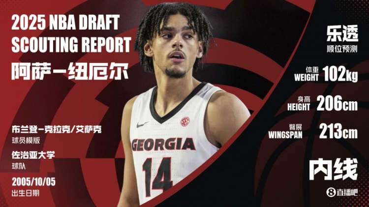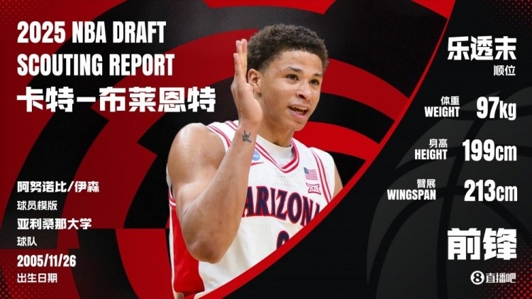 佩尔顿:马刺队在第14顺位选中卡特-布莱恩特。他在亚利桑那大学的唯一赛季里大部分时间都是替补出场,所以他可能不会立即帮助到马刺队。但是从长远来看,布莱恩特拥有那种3D球员的技能组合,理想情况下应该能够与马刺队的核心阵容——维克托-文班亚马、德阿隆-福克斯、年度最佳新秀斯蒂芬-卡斯尔和第2顺位新秀迪伦-哈珀——完美契合。